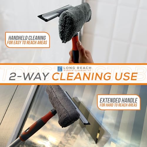 Bendable Head and Long Reach Window Cleaner – Easily reach areas such as window corners and edges because the rubber squeegee window cleaning blade is attached to a bendable head grip and long window cleaning pole. It can be maneuvered easily by hand pressure and remains sturdy enough to clean windows.