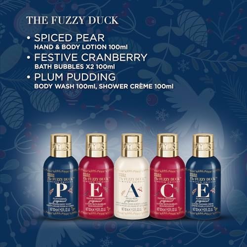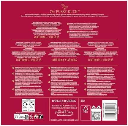 FEATURES: Includes 100 ml body wash, 2 x 100 ml bath bubbles, 100 ml hand & body lotion and 100 ml shower crème all in spiced pear, frosted cranberry and mulberry & mistletoe fragrances