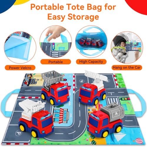 2 in 1 Play Mat&Storage Bag: It can also folds into a storage bag conveniently for the trucks. The built in handle makes it a perfectly portable activity for anytime,The lanyard can also be hung on the tail of the car, and children can take it out to play anytime anywhere Kids enjoy these toys indoor and outdoor, perfect travel toy and road trip toys, help your baby relieve boredom while travel or on the road