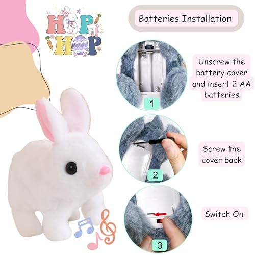 Interactive Bunny Toys:Our super soft, plush bunny comes with a plastic battery compartment with an on/off switch on its tummy. Simply insert 2 AA batteries (NOT INCLUDED) to its underside and it will be energized and ready to go for a day of fun and games