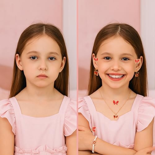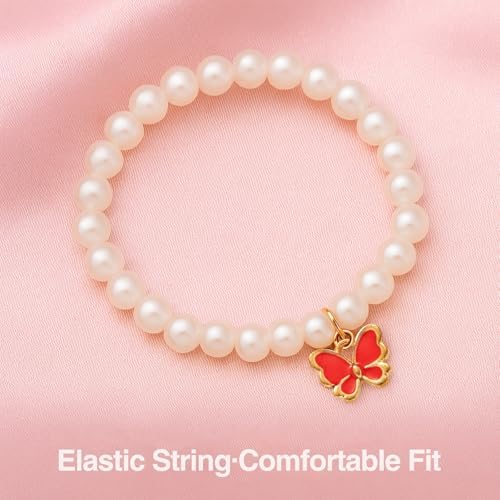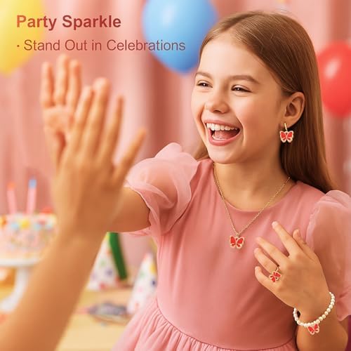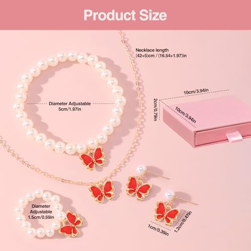 Girl's Jewellery Set: You will receive 1 pink gift box and 3 sets of butterfly pearl jewellery, in pink, white and red. Each set includes a necklace, a pair of earrings, a ring and a bracelet, all adorned with sparkling pearls and butterfly pendants. You can choose the colour to match your outfit style, adding a touch of elegance to your look.