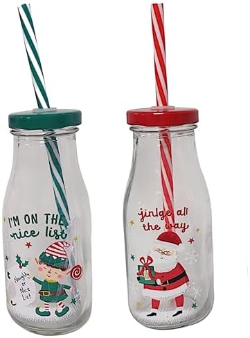 Festive Design: Embrace the festive spirit with this delightful set of two reusable glass milk bottles, featuring charming Santa and elf designs. Bring the holiday cheer with this set of two reusable milk glass style bottles featuring Santa and elf designs.