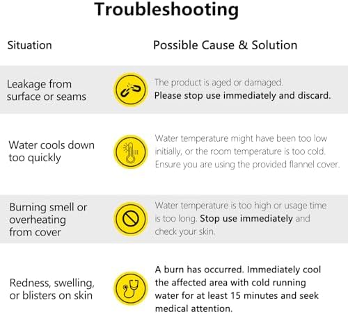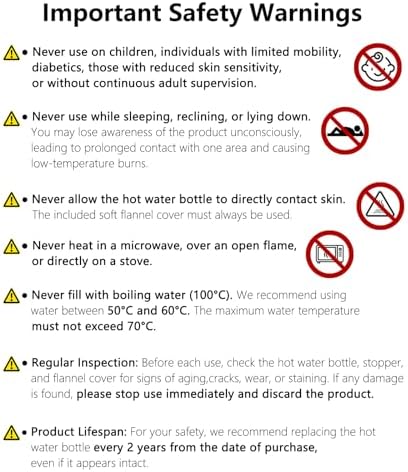 【Important Notes Before Purchase】1. Do not fill the hot water bottle with water exceeding 70°C to avoid scalding; 2. Before use, always check the hot water bottle for leaks. If any leaks are found, please stop using it ! 3. Do not use directly on skin; use with a flannel cover.