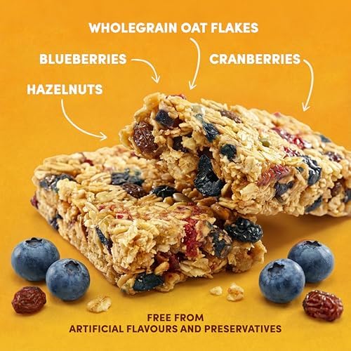 CHEWY BLUEBERRY CEREAL BAR: Made with a blend of golden whole grain oats with blueberry and cranberry pieces, grape and apple juice and chopped almonds, oven-baked for natural sweetness, lasting energy and a chewy texture