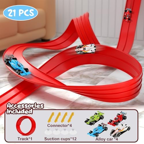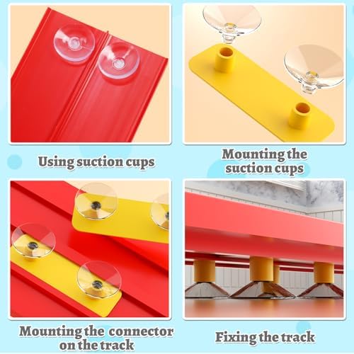 🚘Durable Suction Cup: 12 * Robust suction cups securely attach the track to nearly any surface you desire, from windows and cabinets to tables and walls. Create thrilling loops and turns with confidence as the track holds strong during action-packed races. No batteries required.