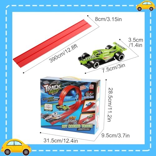 🚘Highly Flexible & Portable: Unfold 4m classic race track features a highly flexible design that allows for easy setup and teardown! Our flexible car track can be easily rolled up and transported, perfectly portable, it's simple to move and store, making it ideal for playtime anywhere.