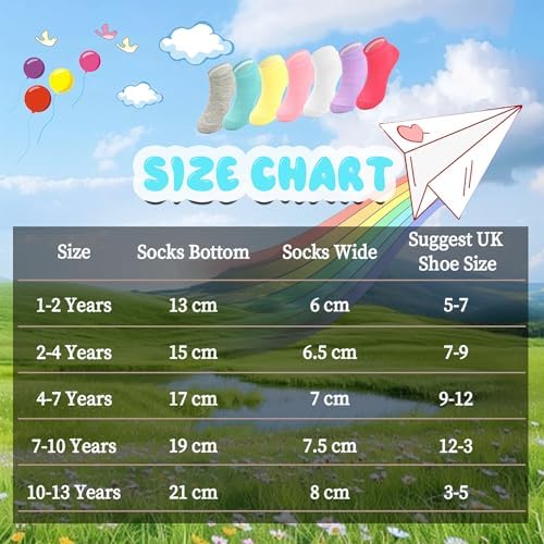 Perfect Fit: Girls short socks are designed specifically for girls aged 1-13.There are 5 sizes to choose from 1-2 years /2-4 years /4-7 years /7-10 years /10-13 years girls. Please refer to the size chart for details to choose suitable socks for your girl.