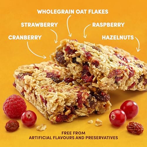 CHEWY RED BERRIES CEREAL BAR: Made with a blend of golden whole grain oats with strawberry, raspberry, cranberry pieces and chopped hazelnuts oven-baked for natural sweetness, lasting energy and a chewy texture