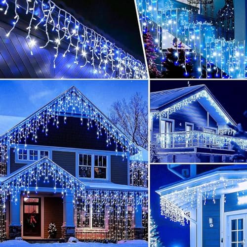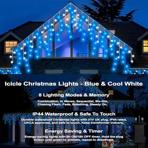 💡 🎅【240 LEDs】: Icicle Christmas lights measures 15m (10m Lead Wire + 5m first drop to last drop), Cable Colour: Clear, LED Count: 240 White & Blue LEDs. UK plug operated.