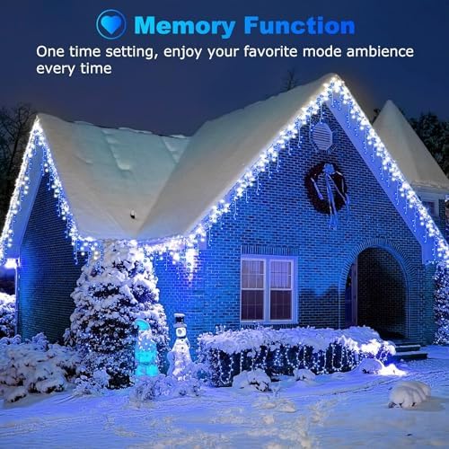 💡 🎅【8 LIGHTING MODES & MEMORY】: Icicle outdoor Christmas lights have 8 Lighting Modes to create a dazzling winter wonderland effect: comb, in waves; sequential, slo-glo, chasing flash, fade, breathing, steady on; various lighting effects. Built-in memory chip remembers your last lighting mode.