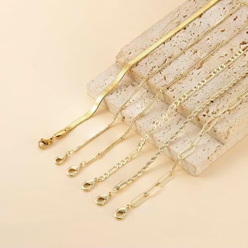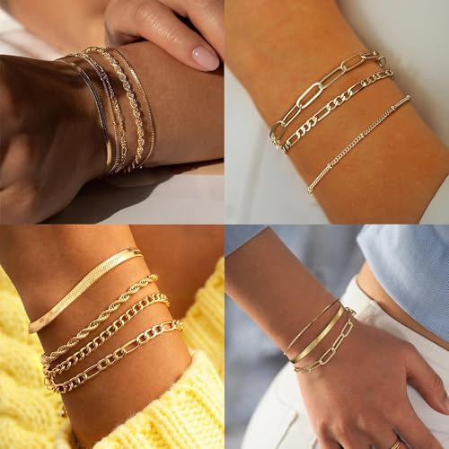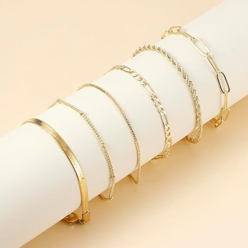 【Elegant Layered Bracelets for Women】This exquisite gold bracelet set features 6 different styles, including satellite chain, box chain bracelet, twist rope bracelet, Figaro bracelet, paperclip bracelet and snake chain bracelet, these layered stackable bracelets allow for creative combinations. Ideal for adding a touch of charm to any outfit.