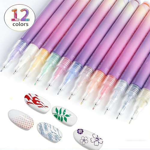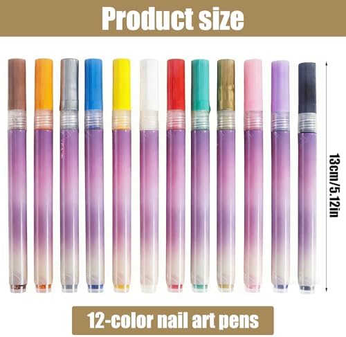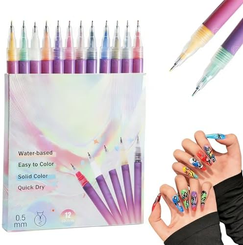 【12 VIBRANT QUICK-DRY COLORS】This nail art pens set presents 12 bold and vibrant shades to suit every style and occasion. The nail art markers utilize a high-pigment, water-based formula that applies smoothly and dries quickly to a smudge-resistant finish. This feature of the nail varnish pens significantly reduces waiting time and protects your artwork, ensuring each design remains vibrant and intact for long-lasting wear, perfect for creating stunning nail art designs that pop.