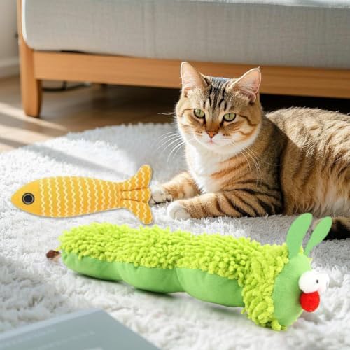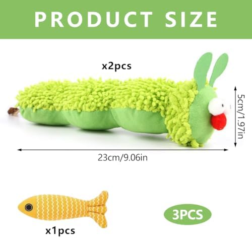 ✅【Safety & Durability Design】: These cat chew toys are crafted from soft and bite-resistant plush material with catnip, galls fruit (Plush Caterpillar Catnip Toy Tail) and ringing paper, these cat chew toys feature reinforced stitching to withstand aggressive biting and scratching. The non-toxic material is gentle on your cat's teeth and gums, ensuring long-lasting play without wear and tear. Perfect for indoor cats who love to play rough. (2 types of combination sets: 2 peppermint caterpillars + 1 peppermint fish and 1 peppermint caterpillar + 1 carrot toy + 1 teasing cat bugs)