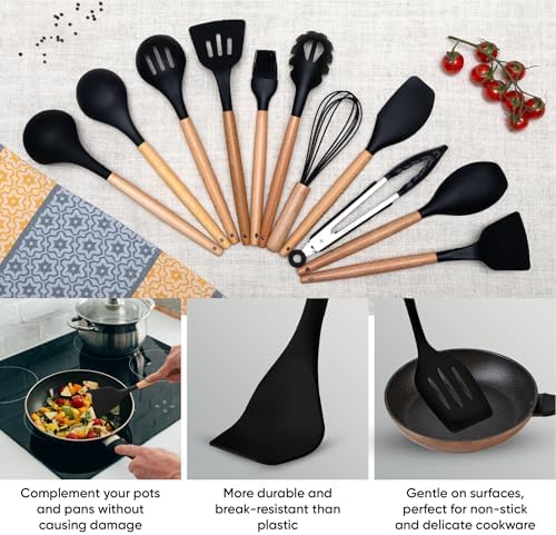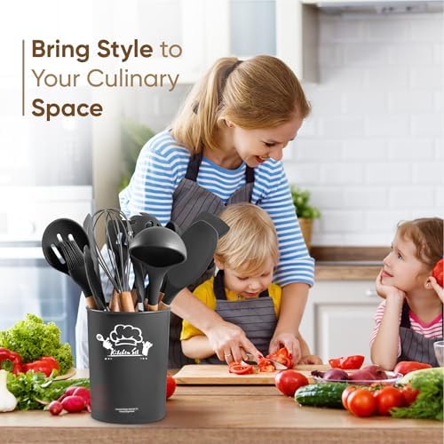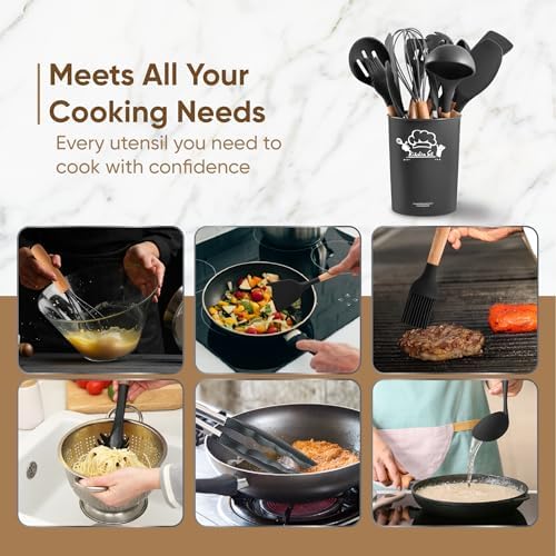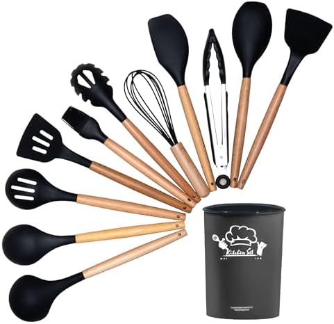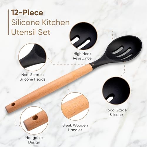 12 Piece Cooking Utensils Set – This kitchen silicone utensils set comes with 12 thoughtfully designed kitchen tools including a Solid Spoon, Slotted Spoon, Pasta Server, Slotted Turner, Solid Turner, Silicone Spatula, Spoon Spatula, Basting Brush, Whisk, Tongs, Soup Ladle, and Utensil Holder