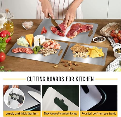 Healthy & Antiseptic: Plastic cutting boards ingest an average of 50 grams of microplastic shavings per year when cutting food, and wooden cutting boards create chips and grooves, absorb liquids, and produce odours when cutting food. titanium chopping board no chemicals or residues are released, Titanium cutting boards offer the best of both worlds without any of the drawbacks.