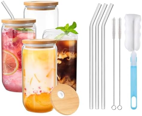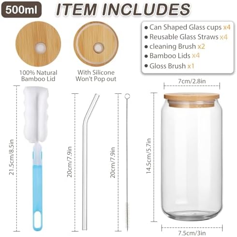 Classic Glass Set: 4 can-shaped glassware with, 4 nature bamboo lids, 4 reusable glass straws, 2 straw brushes and 1 cup brush. Each glass measures 14.5cm in height and 7.5cm in width, holding a liquid of 500ml.