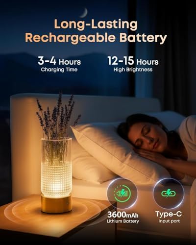 Long-Lasting Rechargeable Power - The battery operated table lamp features a built-in 3600mAh battery for up to 15 hours of cordless operation; USB charging ensures convenience and portability, ideal for bedside or living room use
