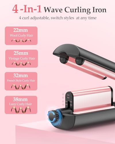 4-In-1 Wave Curling Iron: This adjustable 3 barrel hair waver supports height adjustment of 22/25/32/38mm, making it easy to create four different styling: deep and defined waves, flowing mermaid Waves, loose beachy waves, and undone tousled waves. This french wave curling iron is very suitable for beginners to achieve perfect and long-lasting hairstyles without practice